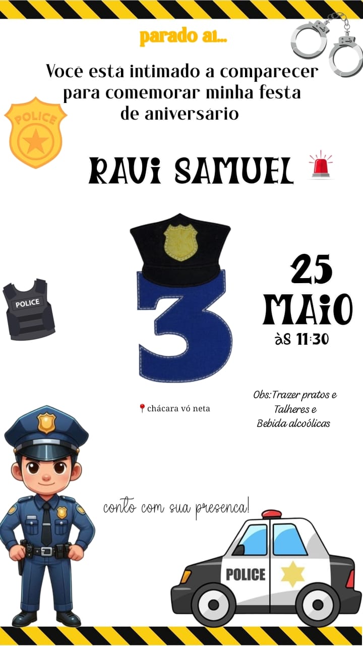 O 5º Batalhão de Polícia Militar agradece o carinho da família e deseja ao Pequeno Ravi que nunca desista dos seus sonhos, e que continue sendo esse exemplo de admiração e respeito pela instituição.
