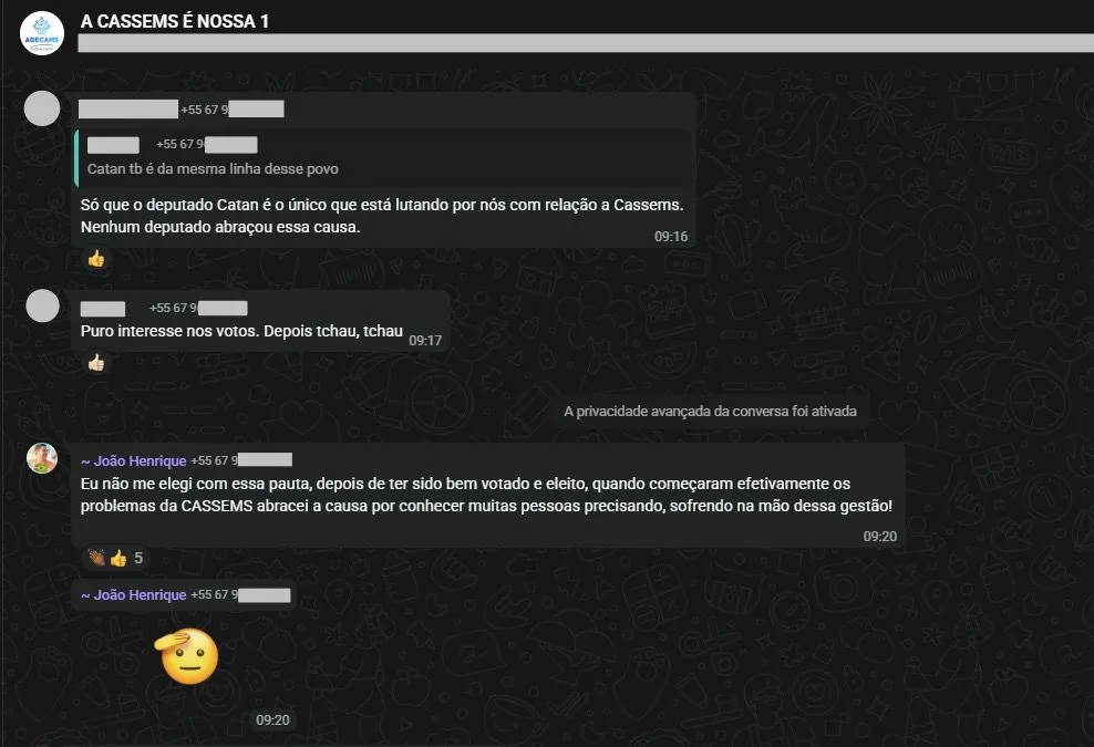 O deputado estadual João Henrique Catan (Novo) passou a enfrentar uma onda crescente de críticas em grupos internos de beneficiários da Cassems. Em uma das manifestações, publicada no grupo “A CASSEMS É NOSSA 1”, uma participante afirmou que o parlamentar atua por “puro interesse em votos” e que, após o período eleitoral, “é tchau, tchau”.